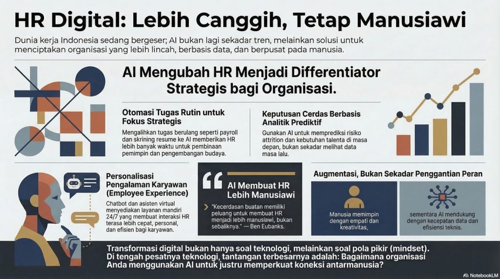 Di tengah gelombang besar Industri 4.0, sebuah dilema fundamental kini mendarat di meja para pemimpin bisnis: Apakah Kecerdasan Buatan (Artificial Intelligence/AI) akan menggantikan peran manusia dalam mengelola manusia, atau justru memperkuatnya? Bagi kita di Indonesia, yang merupakan pilar penting dari lanskap Global South, pertanyaan ini bukan sekadar wacana teknis, melainkan tantangan eksistensial. Kita sedang bergeser dari era di mana manusia dibantu mesin, menuju kondisi unik di mana manusia mungkin berada dalam posisi membantu mesin untuk mencapai efisiensi maksimal. Namun, di tengah banjir teknologi ini, satu hal tetap pasti: AI mampu memproses data, tetapi ia tidak memiliki “jiwa” untuk memahami kompleksitas rasa seorang karyawan.